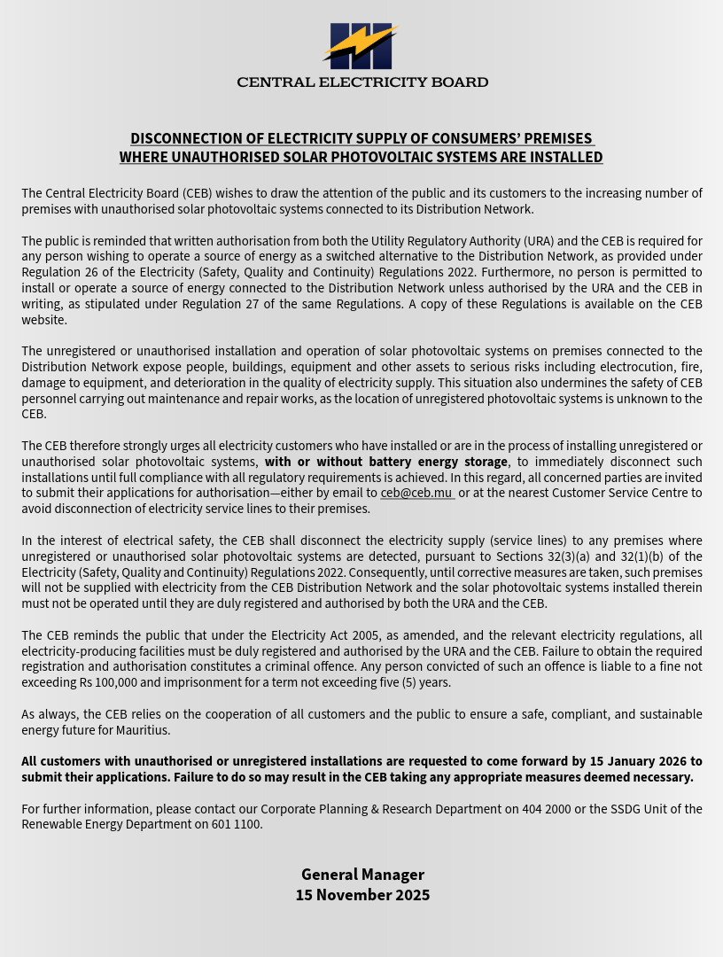 CEB COMMUNIQUE - DISCONNECTION OF ELECTRICITY SUPPLY OF CONSUMERS’ PREMISES WHERE UNAUTHORISED SOLAR PHOTOVOLTAIC SYSTEMS ARE INSTALLED