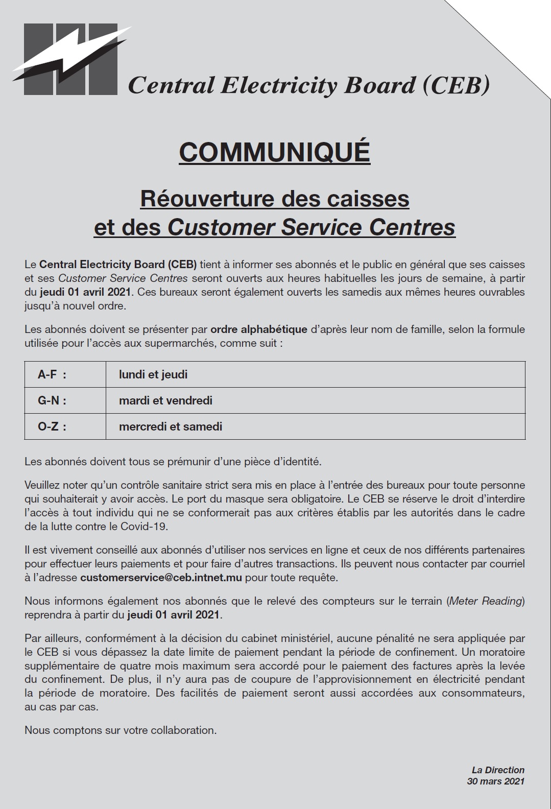 CEB COMMUNIQUE Réouverture des caisses et des Customer Service Centres